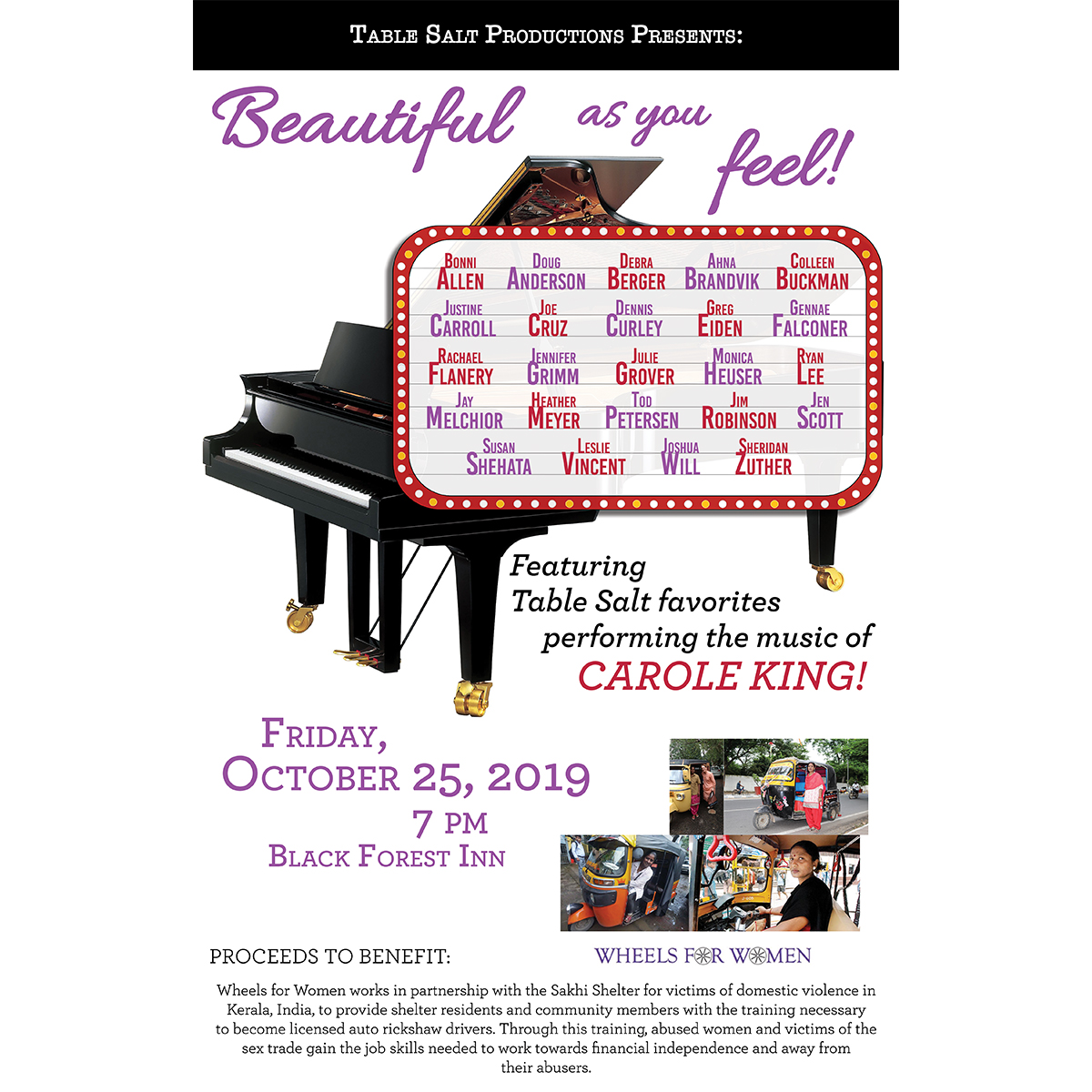 Join us on October 25, 2019, to celebrate and support the critical work being done by Wheels for Women, an organization that works in partnership with the Sakhi Shelter for victims of domestic violence in Kerala, India, to provide shelter residents and community members with the training necessary to become licensed auto rickshaw drivers (like taxi drivers in the U.S.). Through this training, abused women and victims of the sex trade gain the job skills needed to work towards financial independence and away from their abusers. The show will begin at 7 pm in the side room of the iconic Black Forest Inn in Minneapolis, and will include musical performances from favorite Table Salt artists as well as a fundraising raffle.