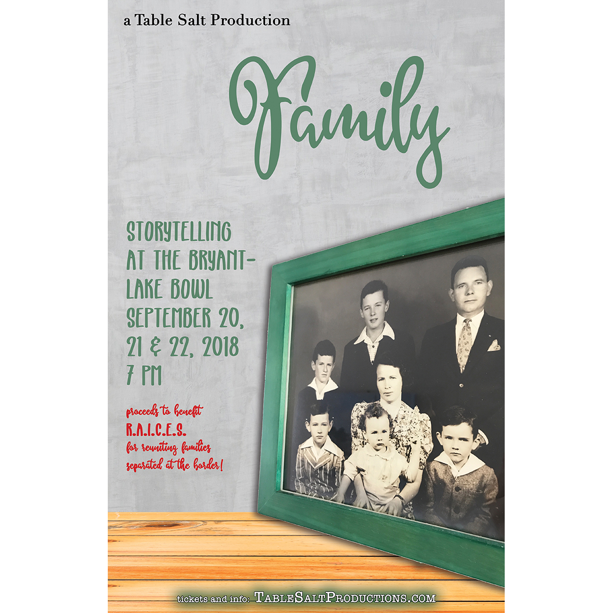 Fluid.  Fear!  Father!  Favorite.  In its fifth annual installment, Table Salt now brings you a storytelling show for the Family.  Come hear tales of families of origin and families of choice from your favorite Twin Cities storytellers!  If that’s not reason enough to book your ticket, know that all proceeds will be going to the Refugee and Immigrant Center for Education and Legal Services (RAICES) to support their efforts to reunite migrant families who were so cruelly separated at our borders.  We hope you will join us.